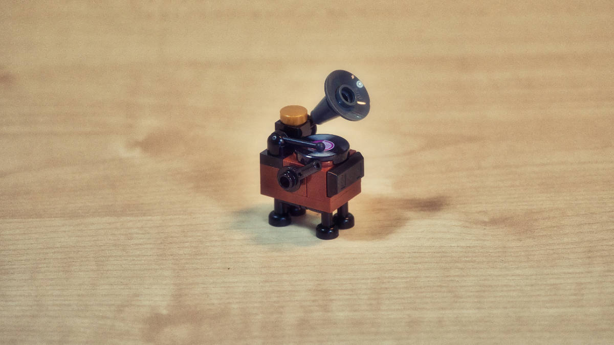 A gramophone or phonograph built from 21 LEGO® pieces. It uses a mini antenna to depicture the tonearm and a paraboloid to mimic the horn. For the disc a printed part is used.